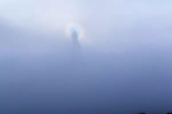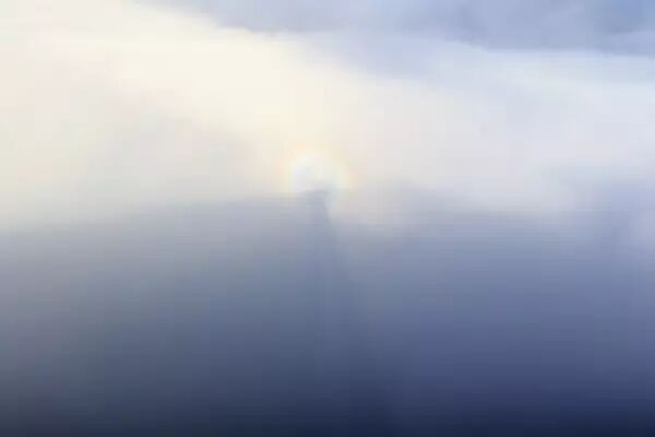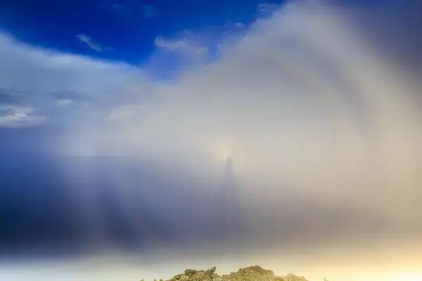 而此时,佛光出现在面前的云海上。佛光是一种非常特殊的自然物理现象,其本质是太阳自观赏者的身后,将人影投射到观赏者面前的云彩之上,云彩中的细小冰晶与水滴形成独特的圆圈形彩虹,人影正在其中。佛光的出现需要阳光、地形和云海等众多自然因素的结合,只有在极少数具备了以上条件的地方才可欣赏到。