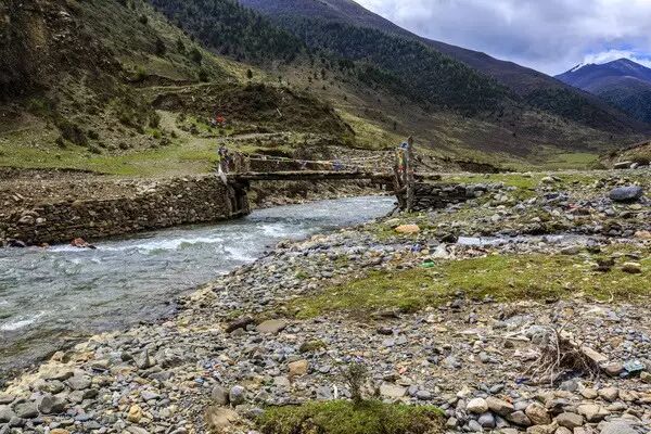 河滩上遍布卵石,黄色的花朵映入眼帘。